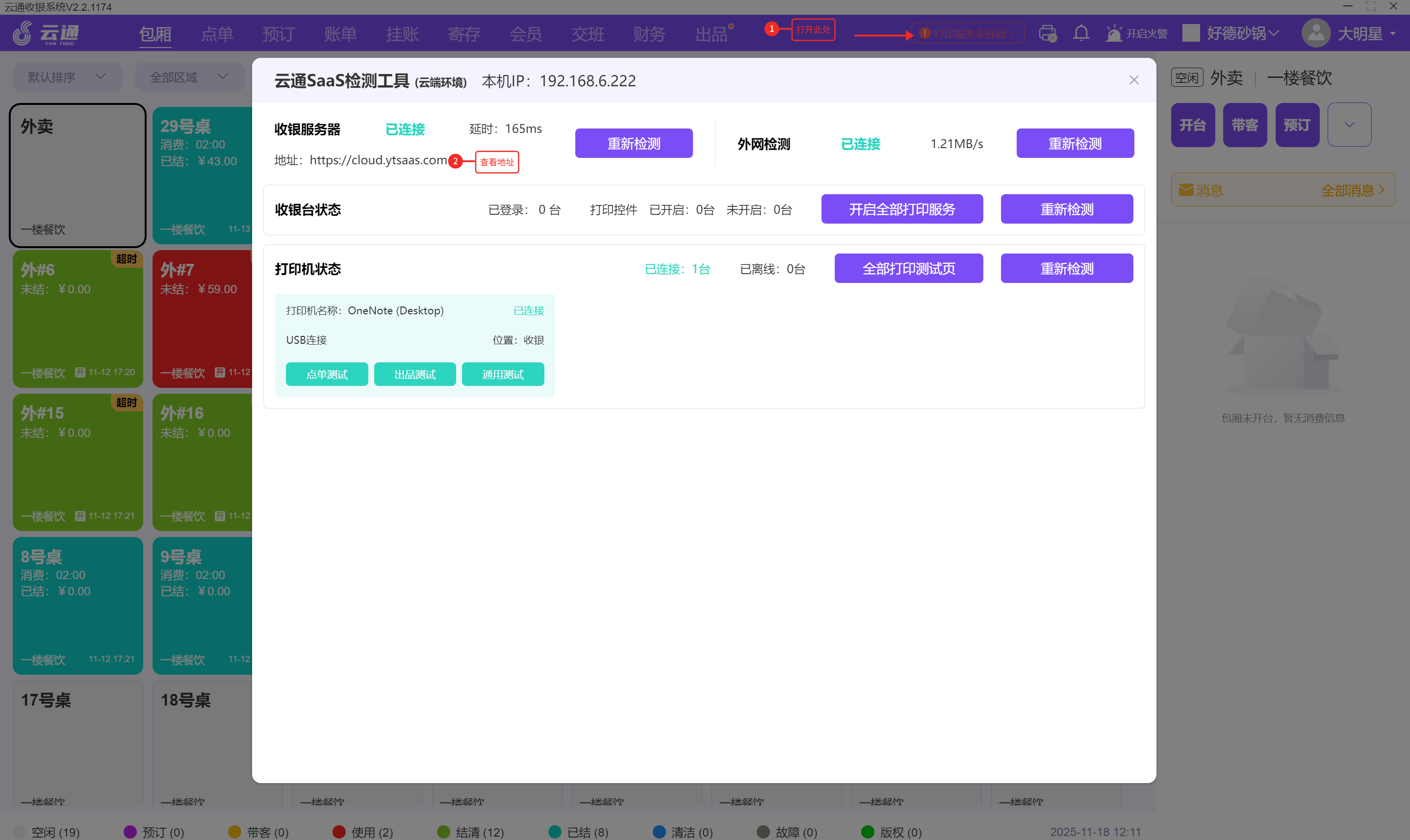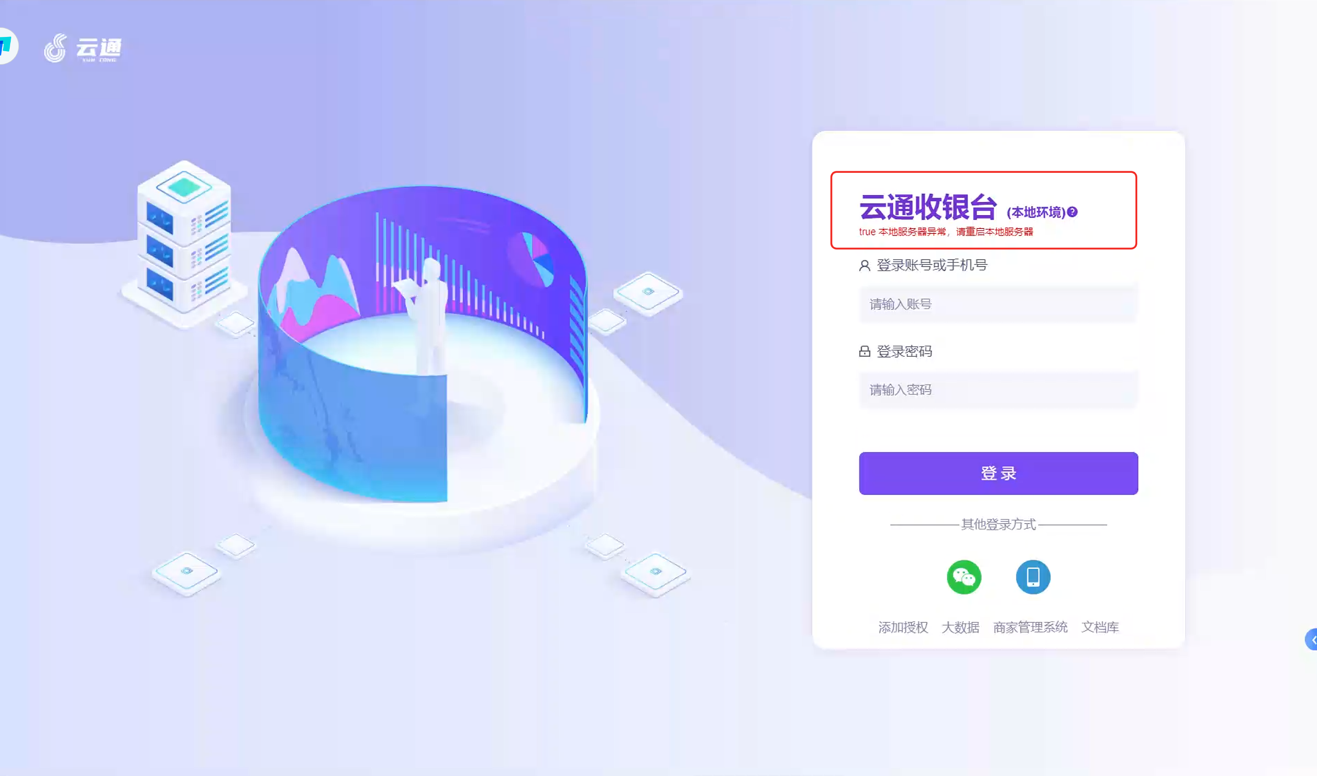 # 常见问题1:登陆提示本地网络错误问题 当登陆界面中提示出现网络错误问题,并提示“请重启服务器”时,可以检查服务器是否启动或者服务器网络链接是否正常。  优先按照以下顺序进行检查: 第一步:检查服务器是否启动,如果能够启动还有此提示检查第二步 第二步:检查服务器网线接口是否亮灯,或者交换机或路由器是否有问题 第三步:检查本机电脑网络链接状态,如果无法访问外网可以尝试运行命令行访问服务器进行测试,如果能够成功访问服务器则可以使用本地环境 当执行上述步骤依然无法解决本地服务器问题,可以使用Ctrl+L快捷键,切换到云端环境。当登录界面提示“云端环境”几个提示字的时候,就可以在云端环境下使用收银 特别说明:当使用本地服务器环境的情况下,需要将所有电脑都切换成本地服务器环境,不可混乱使用。  # 常见问题2:宽带链接出现问题如何继续使用收银软件 当登陆界面提示网络错误,或使用云端环境下,进入系统后出现“network error”提示,表示云端环境下的网络出现错误。 优先按照以下顺序进行检查: 第一步:检查宽带网络是否正常,通过打开电脑浏览器访问其他网站,查看是否能够打开。或者使用命令行工具访问“https://sycloud.ytsaas.com” 进行尝试。如果无法访问,可以使用本地环境。 第二步:开启本地收银服务器,并且在收银台使用Ctrl+L切换到本地环境,在登陆界面提示“本地环境”的情况下,可以使用本地服务器继续使用收银 第三步:如果已经登录收银台后,发现网络无法使用并且无法使用云端,优先检查此电脑网络的情况,如果网络畅通且没有宽带外网,可以使用本地化收银服务器环境 第四步:登陆后在首页中的“打印检测工具”中点开弹窗,查看当前电脑使用的服务器地址,如果是:192.168.xx.xx的形式,代表使用的是本地服务器环境,如果显示的“https://cloud.ytsaas.com” 则代表试用的是云端环境的模式