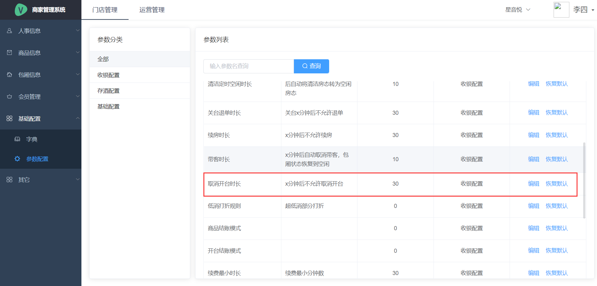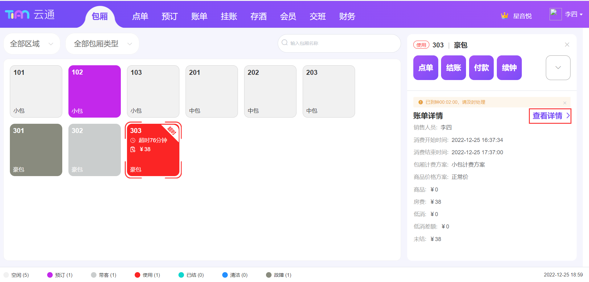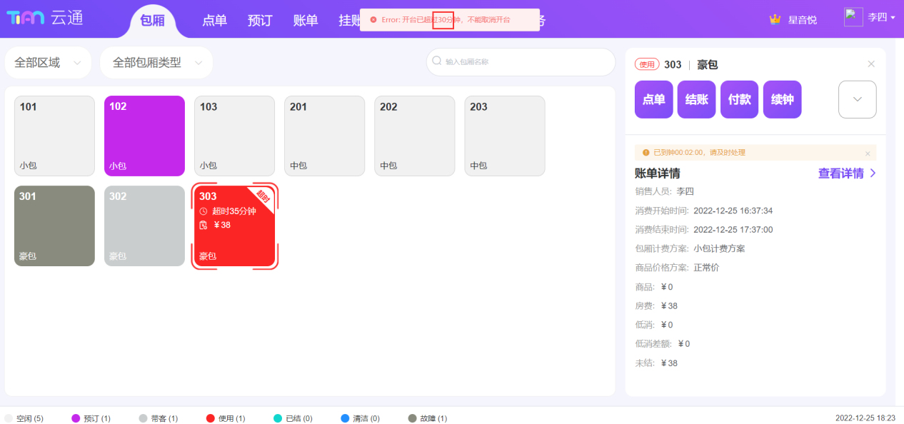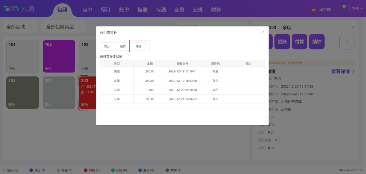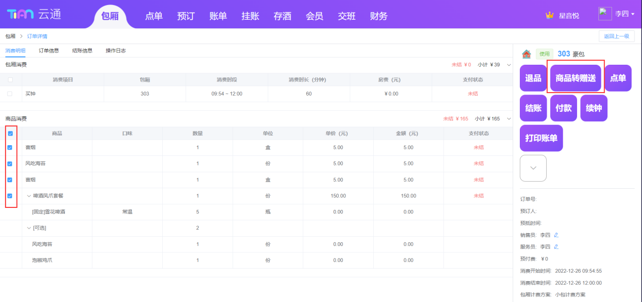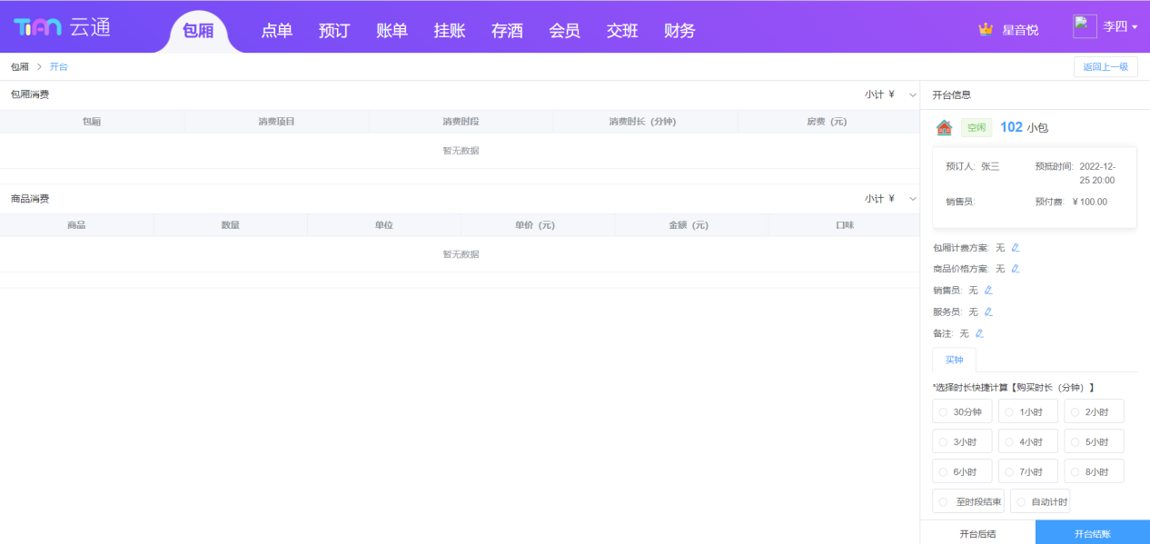 ## 登录 使用浏览器访问地址[https://syc.tianyinvod.com](https://syc.tianyinvod.com/ "https://syc.tianyinvod.com"),进入登录页面,输入账号、密码成功登录  ## 退出登录 点击导航栏的用户头像,点击弹出的【退出登录】按钮成功退出登录  ## 切换门店 点击导航栏的门店名称,选择需要切换的门店 ## 包厢 ### 带客 进入【包厢】页面,选择一个【空闲】状态的包厢,并点击【带客】按钮,在警示框中点击【确定】 注:一定时间(系统默认10分钟,可前往【商家管理系统-参数配置-带客时长】修改)后将自动取消带客,包厢状态恢复到【空闲】  ### 取消带客 进入【包厢】页面,选择一个【带客】状态的包厢,并点击【取消带客】按钮,在警示框中点击【确定】,包厢状态变更为【空闲】 注:一定时间(系统默认10分钟,可前往【商家管理系统-参数配置-带客时长】修改)后将自动取消带客,包厢状态恢复到【空闲】  ### 开台 进入【包厢】页面,选择一个【空闲】状态的包厢,并点击【开台】按钮,跳转到【开台】页面  根据客人的需求,选择买断或者买钟,点击【开台后结】,则不弹出【结账】页面,点击【开台立结】,则弹出【结账】弹窗 如果买钟时选择“自动计时”,则在结账时才产生包厢消费订单  ### 预订 进入【包厢】页面,选择一个包厢,并点击【预订】按钮,弹出【新增预订】弹窗  填写信息后,点击【保存】按钮  ### 预订开台 进入【包厢】页面,选择一个【预订】状态的包厢,并点击【预订开台】按钮,跳转到【开台】页面  根据客人的需求,选择买断或者买钟,点击【开台后结】,则不弹出【结账】页面,点击【开台立结】,则弹出【结账】弹窗  ### 预付费充值 进入【包厢】页面,选择一个【使用】、【预订】、【已结】状态的包厢,点击【预付费】按钮,进入预付费页面  点击【充值】按钮,打开【充值】弹窗  填写充值信息后,点击【保存】  ### 预付费充公 进入【包厢】页面,选择一个【使用】、【已结】状态的包厢,点击【预付费】按钮,进入预付费页面  点击【充公】按钮,打开【充公】弹窗  填写充值信息后,点击【保存】  ### 预付费退款 进入【包厢】页面,选择一个【使用】、【已结】状态的包厢,点击【预付费】按钮,进入预付费页面  点击【退款】按钮,打开【退款】弹窗  填写退款信息后,点击【确定】按钮  ### 取消开台 进入【包厢】页面,选择一个【使用】状态的包厢,并点击【取消开台】按钮,在警示框钟点击【确定】  如果开台时间已超过参数设置的值(系统默认30分钟,支持编辑),则不能取消开台   ### 续钟 进入【包厢】页面,选择一个【使用】或【已结】状态的包厢,点击【续钟】按钮,进入续钟页面  根据客人的需求,选择买断或者买钟,点击【开台后结】,则不弹出【结账】页面,点击【开台立结】,则弹出【结账】弹窗 此处需要注意: 1. 自动计时模式不能续钟 2. 从消费结束时间开始续钟 3. 已结状态下的账单超过参数设置的续钟时间(可前往【商家管理系统→参数配置】设置【续房时长】参数)后也不可续钟  ### 点单 进入【包厢】页面,选择一个【使用】状态的包厢,点击【点单】按钮,进入点单页面  根据客人的需求选择商品,点击【落单后结】可以暂不支付,点击【结账】则弹出【结账】页面  选择商品后,可以点击【存单】按钮进行存单,也可以点击【取单】按钮进行取单,存单信息将会在每个营业开始时间自动清空  ### 锁定 进入【包厢】页面,选择一个【使用】状态的包厢,点击【锁定】按钮,此时不能再继续点单、续钟等操作  ### 取消锁定 进入【包厢】页面,选择一个【使用】状态且已锁定的包厢,点击【取消锁定】按钮,此时可以继续点单、续钟等操作  ### 退单 进入【包厢】页面,选择一个【使用】状态的包厢,点击【退单】按钮,可以选择未结的订单进行退单操作   ### 赠送商品 进入【包厢】页面,选择一个【使用】状态的包厢,点击【赠送商品】按钮,进入赠送商品页面  进入赠送商品页面前,需要员工进行授权操作  授权成功后,可以选择赠送商品,点击【赠送】按钮即赠送成功 另:赠送权限、赠送限额可以前往【商家管理系统-员工管理-编辑权限-赠送权限】进行设置  ### 赠送时长 进入【包厢】页面,选择一个【使用】状态的包厢,点击【赠送时长】按钮,进入赠送时长页面  进入赠送时长页面前,需要员工进行授权操作  授权成功后,可以选择赠送时长,点击【赠送】按钮即赠送成功 另:赠送权限、赠送限额可以前往【商家管理系统-员工管理-编辑权限-赠送权限】进行设置  ### 付款 进入【包厢】页面,选择一个【使用】状态的包厢,点击【付款】按钮,进入付款页面  选择未结状态的订单,点击【保存】按钮  ### 结账 进入【包厢】页面,选择一个【使用】状态的包厢,点击【结账】按钮,进入结账页面  选择付款方式,并输入金额后,点击【保存】按钮 注:组合支付时,线上支付方式结账时只能选择一种  如果客人有会员卡,则可以点击【会员】按钮,可以使用会员卡打折、会员卡余额支付   如果使用员工折扣,则点击【打折】按钮,可以员工授权后进行打折  如果使用减免的方式进行优惠,则点击【减免】,可以员工授权后进行一定金额的减免  如果需要挂账,则点击【挂账】按钮,可以将金额挂在个人或者单位名下  ### 关房 进入【包厢】页面,选择一个【已结】状态的包厢,点击【关
