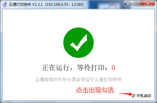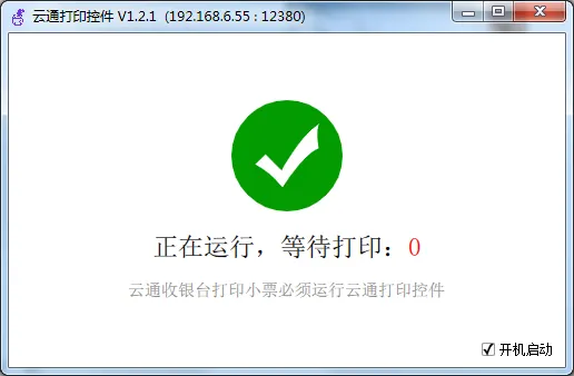 # 启动自检解决办法 ### 问题:提示网络故障怎么解决? - 软件启动自检提示网络未连接怎么解决? #### 解决方法:检查电脑网线是否连接正确 1、观察电脑屏幕右下角,此图标显示红色叉则表示网线错误或其他网络故障,请联系网络管理员解决。  2、如果未显示红色叉,依然检测网络故障。可以尝试重启启动收银软件或解决。 ### 问题:打印控件未启动怎么解决? - 如果系统自检提示  #### 步骤 1:在电脑桌面寻找文件夹“PrinterServerTool”。并且双击鼠标左键打开。(注:不用在意v1.21等内容)  #### 步骤 2:查找紫色图标“PrinterServerTool”,找到后鼠标选中双击左键打开  #### 步骤 3:当电脑右下角显示步骤 2 中的紫色图标或出现以下界面代表打印控件启动成功 - 出现此图标代表“打印控件”启动成功  - 出现此界面也表示“打印控件”启动成功  #### 步骤 4:启用打印控件后,点击开机启动为勾选状态,再次电脑开机后会自动启动  #### 其他方法:如果未找到打印控件文件夹,可以点击此链接进行下载:[点此下载](https://doc.tianyinvod.com/%E6%94%B6%E9%93%B6%E6%89%93%E5%8D%B0%E6%8E%A7%E4%BB%B6/PrinterServerTool_V1.2.13.zip)